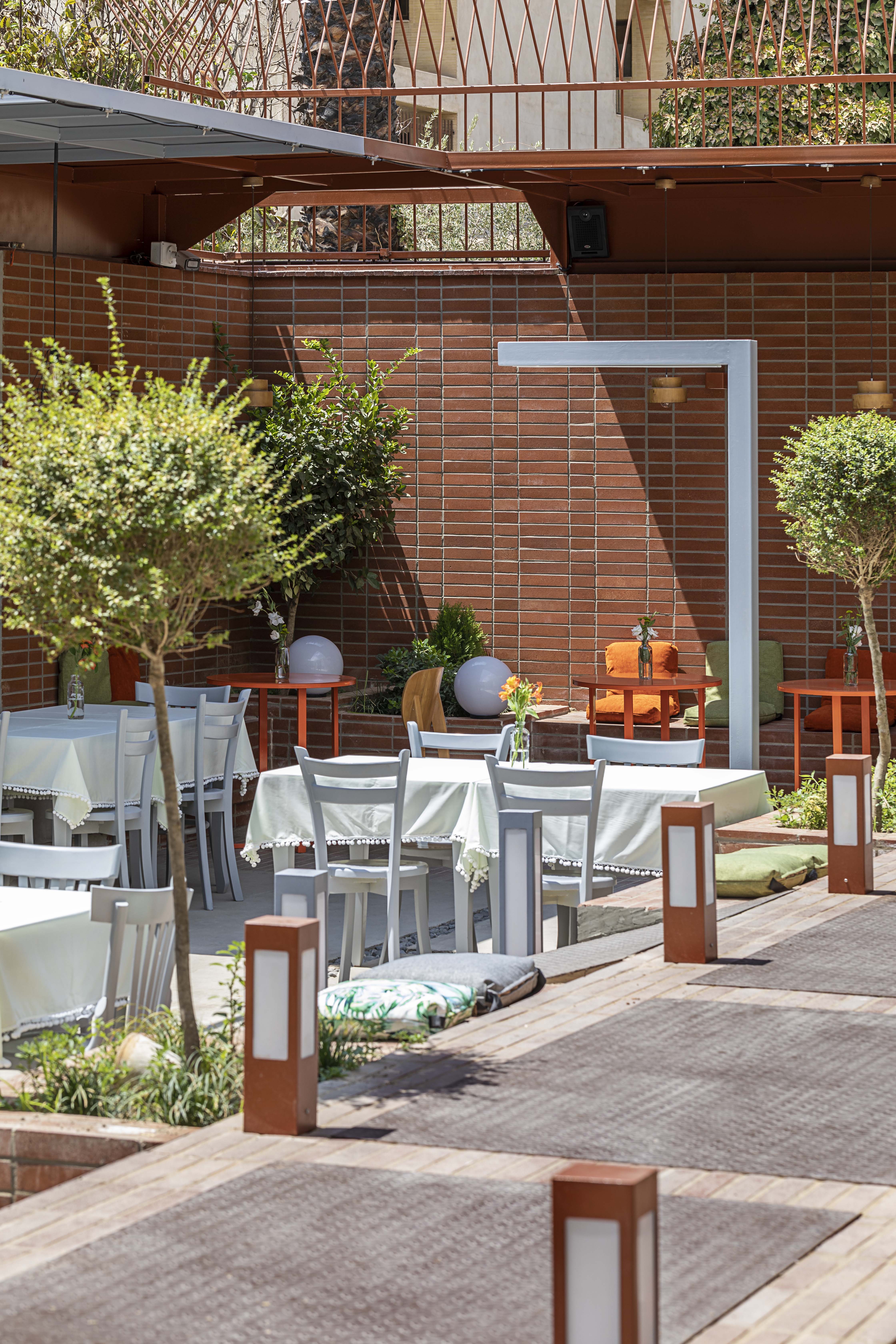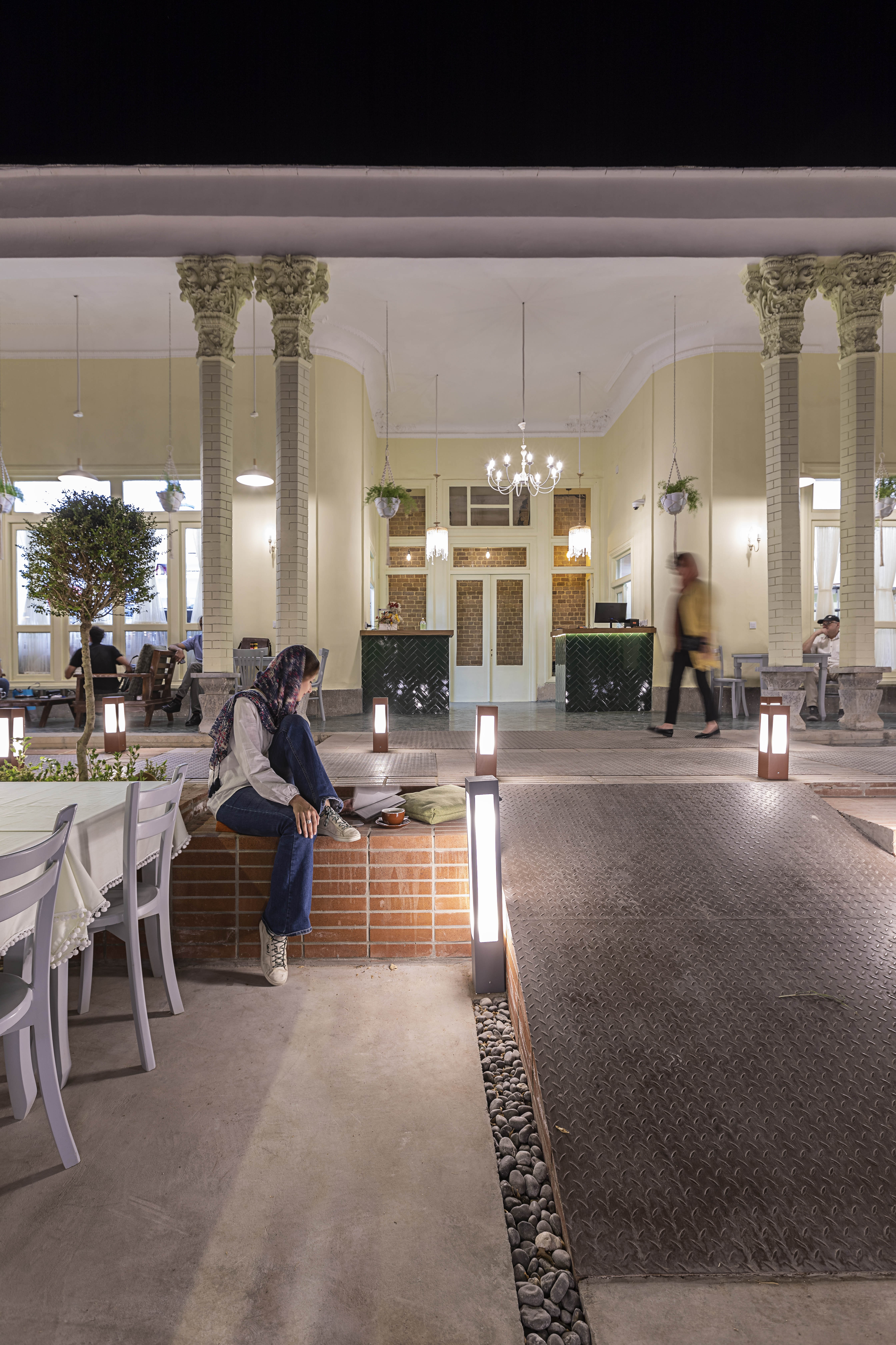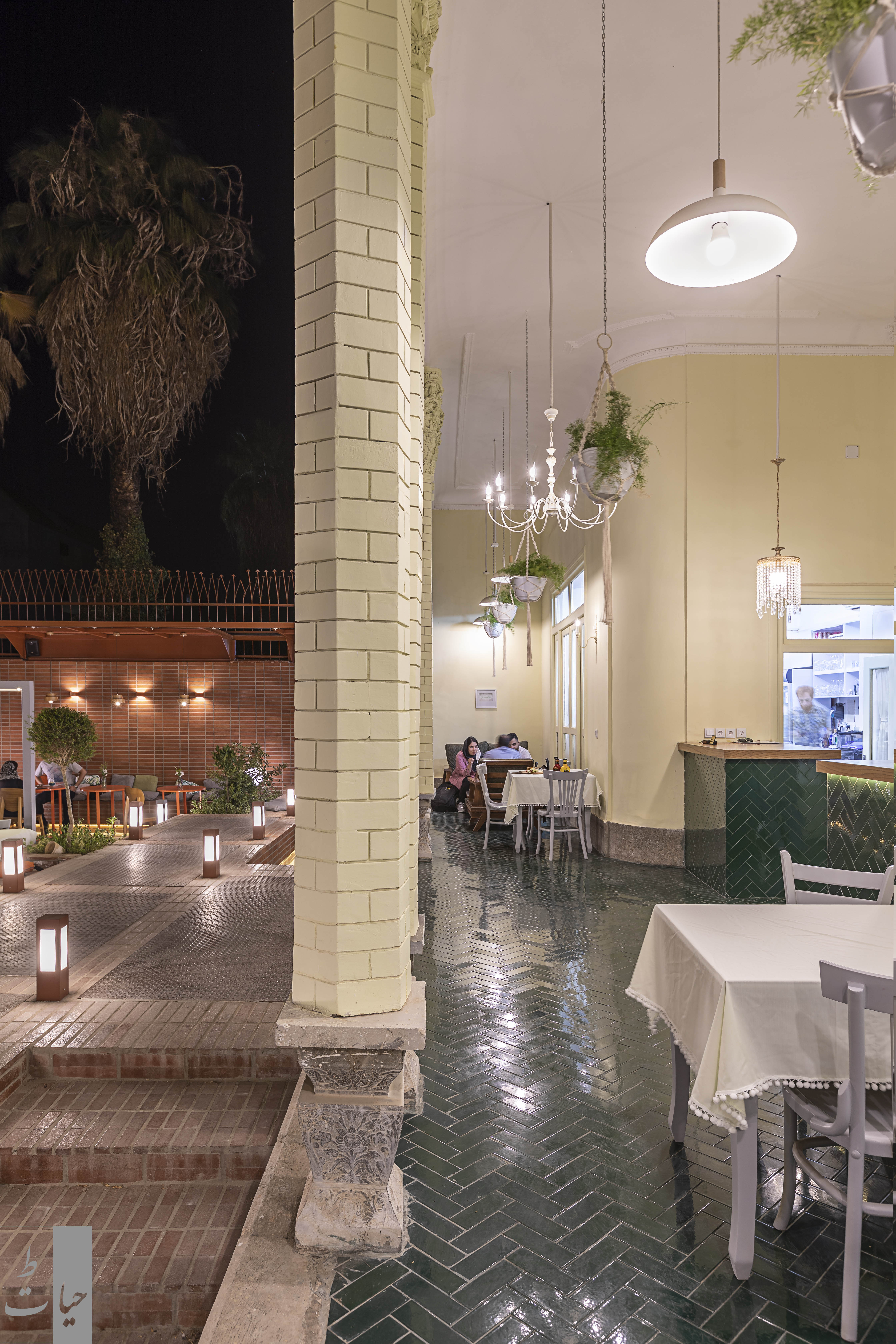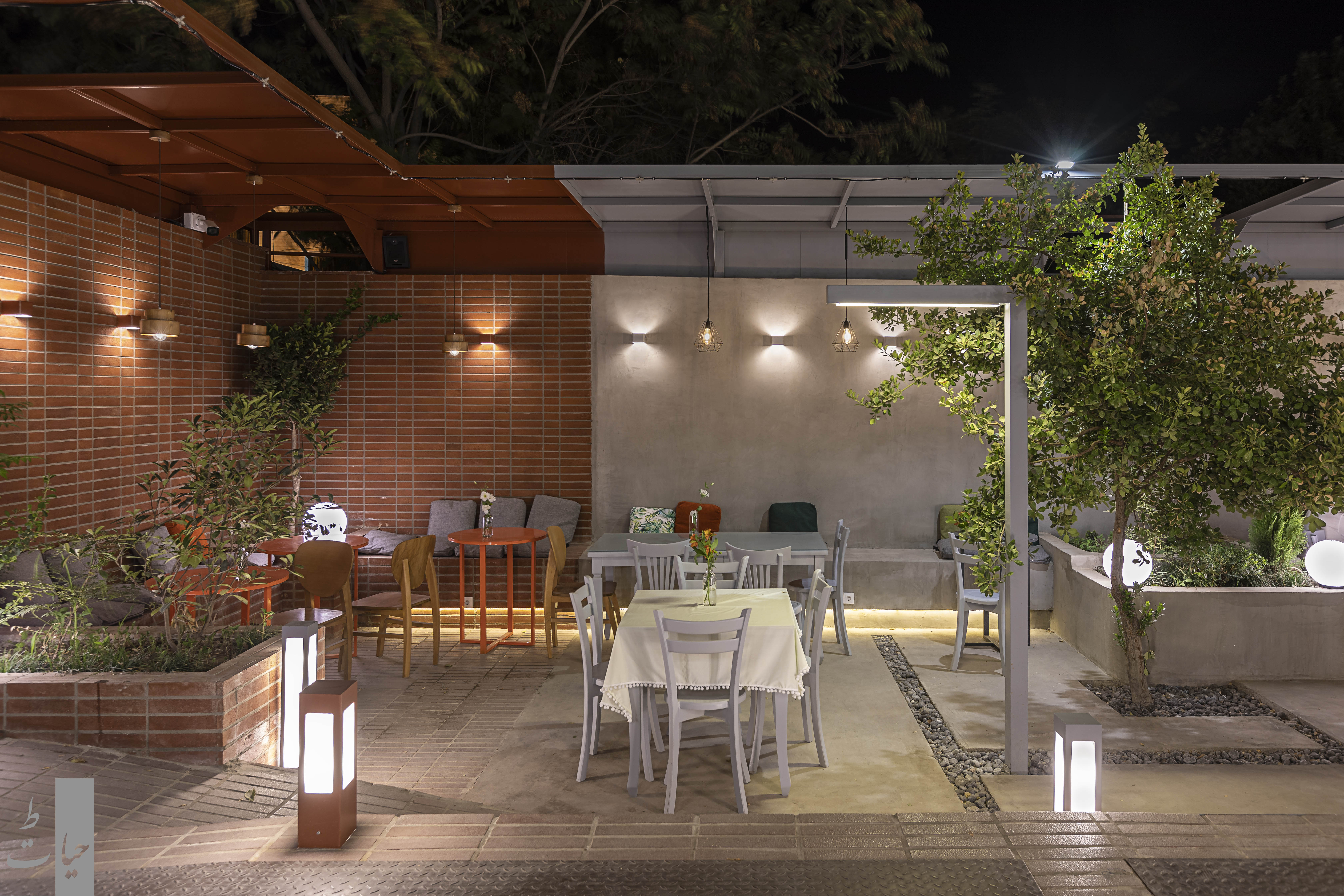 ایدهی اصلی طرح با توجه به واقع شدن خانه در کوچهی پر رفت و آمد و به موازات چهارباغ عباسی بر این اساس شکل گرفت که فضای کافه به عنوان پلازایی محلی و در پیوند با گذر و شهر تعریف شود. در این راستا محور اصلی حرکتی به موازات ایوان در حیاط خانه تعریف شد. همچنین به علت شیبدار بودن حیاط و اختلاف ارتفاع ما بین ایوان و حیاط، مفصل ارتباطی به گونهی طراحی شد که این اختلاف ارتفاعات به شکلهای گوناگون در آن تعریف و حل شود. در این مفصل ارتباطی کیفیتهای گوناگون جهت مکث و حرکت هم چون محل عبور،پله، رمپ، سکوی نشستن، باغچه تعبیه شد. با توجه به محدودیت مساحت فضای ساختمان قسمتهای تهیه و آمادهسازی کافه در ساختمان و فضای کافه به صورت فضایی نیمهباز در حیاط جانمایی شد.